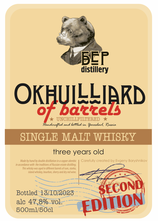 Мы уже неоднократно писали о первом удачном опыте сложного купажа солодового уиски из нескольких малых бочек. OKHUILLIARD OF BARRELS получился на славу. Интересный, вкусный. В снифтере со временем начинает меняться, и тогда можно поймать несколько вкусов исходного напитка, благодаря улетающим в окружающее пространство эфирам и прочим легким соединениям.